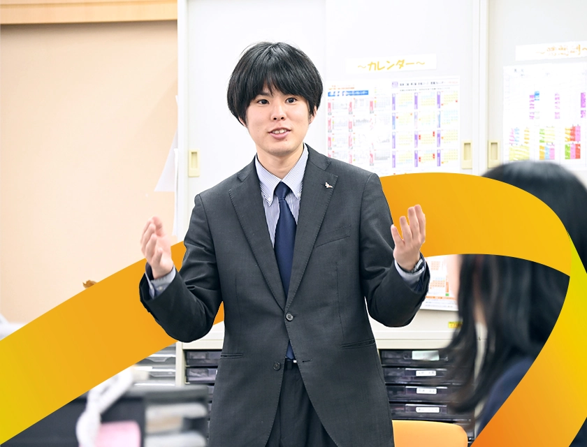 入社当初は教科指導を担当。勉強面では成績向上をめざした際に、何が課題となっておりどう解決すればいいのかを考える学習管理について、経験を重ねました。また集団指導という面では、生徒一人ひとりの個性を考慮しながら全体の成果を目指していくべく、公教育ではなく塾という立場だからこそできることについて、自分の考えを深めることができたと思っています。